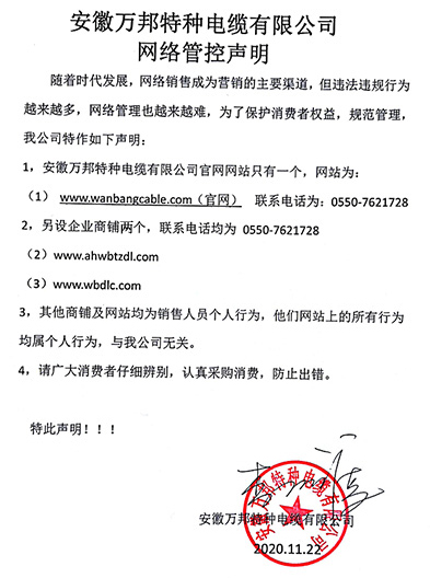 鄭重聲明:安徽萬邦特種電纜有限公司官方網站為:www_wanbangcable_com.dcltjwn.cn,除此之外無任何子網站或合作網站,其余均為假冒偽劣。電話:0550-7621728 13485756353 地 址:安徽省天長市滁州高新技術產業開發區經四路29號